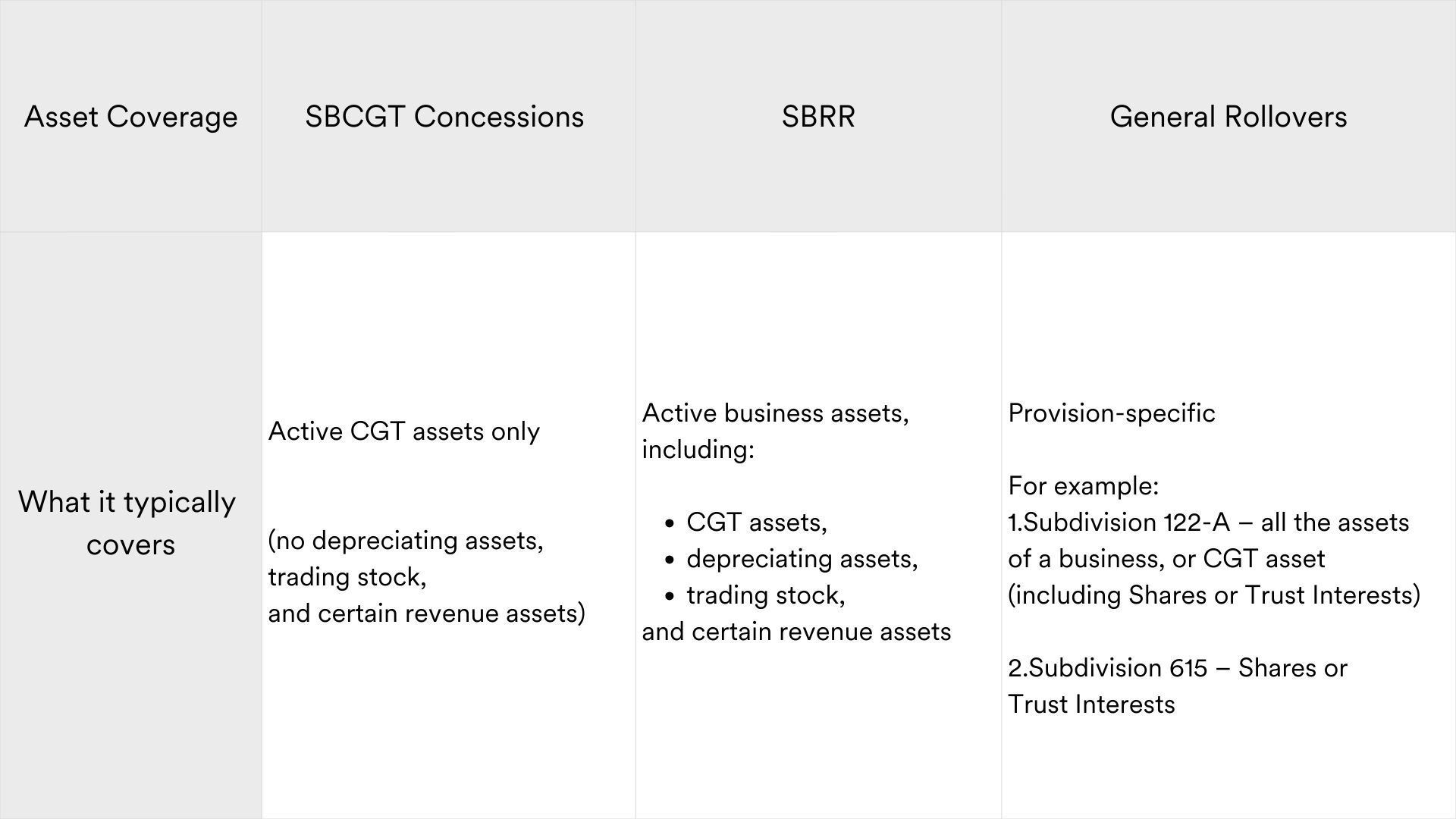 Unlike the SBCGT concessions, the SBRR can apply to a wider range of active business assets, including CGT assets, depreciating assets, trading stock, and revenue assets. This makes it particularly relevant when you restructure an operating business with significant plant, equipment, and stock.
